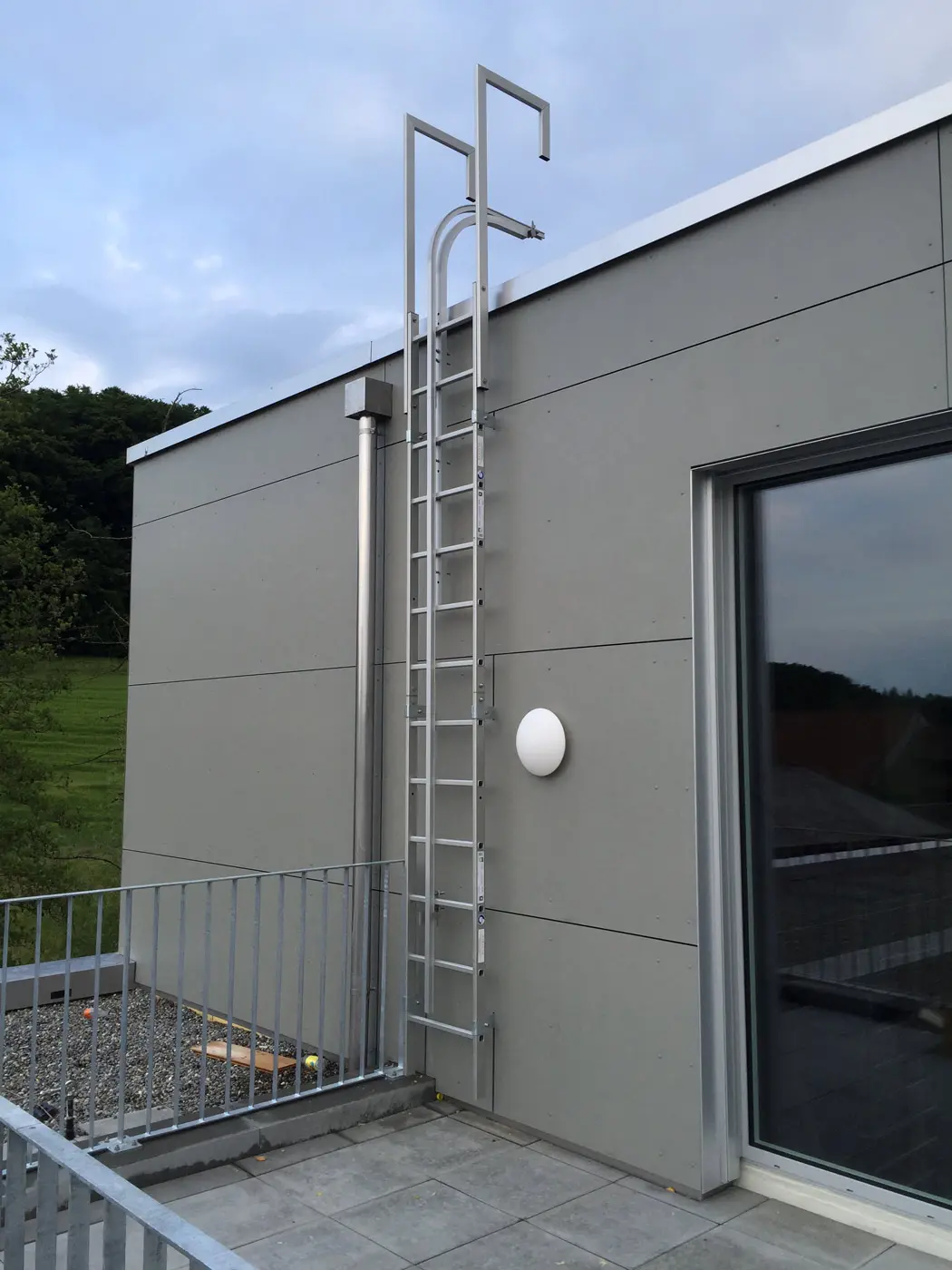 Oft führen weder Treppen noch Dachaufgänge direkt auf die Dachfläche. In diesen Fällen sind ortsfeste Steigleitern, wahlweise mit oder ohne Rückenschutz, eine gute Option für einen sicheren Dachzugang. Steigleitern sorgen gerade in Verbindung mit Geländerkomponenten für eine sichere und kostengünstige Zugangsmöglichkeit.